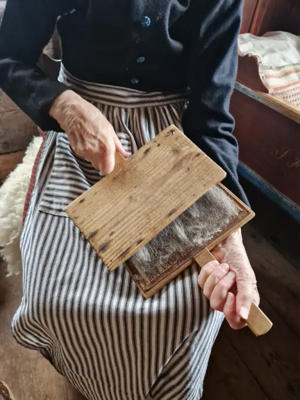 Deretter blir elevane delt i 2 grupper. I den eine gruppa får elevane prøve å karde ull og spinne på handtein saman med museumsformidlar.